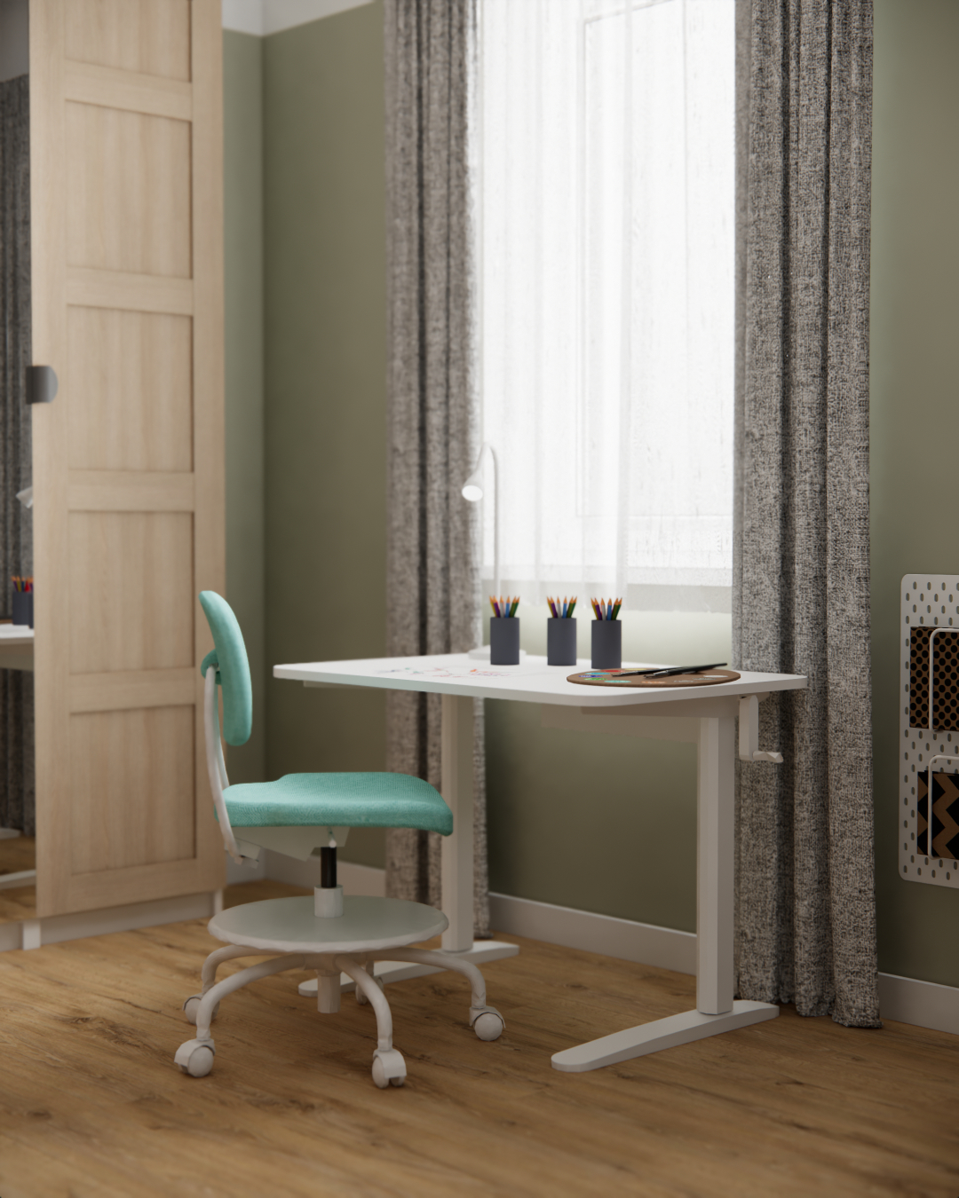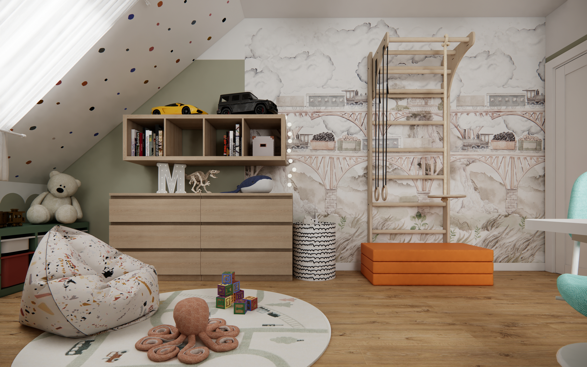Zaproponowaliśmy stonowaną paletę barw – biel , oliwka, odcienie drewna – uzupełnioną o kolorystyczne akcenty, które podkreślają, że to przestrzeń dla dziecka. Motyw kolei pojawia się w detalach – dekoracjach ściennych i dodatkach – dzięki czemu wnętrze zyskało indywidualny charakter, ale pozostało harmonijne i łatwe do adaptacji na kolejne etapy dorastania.
