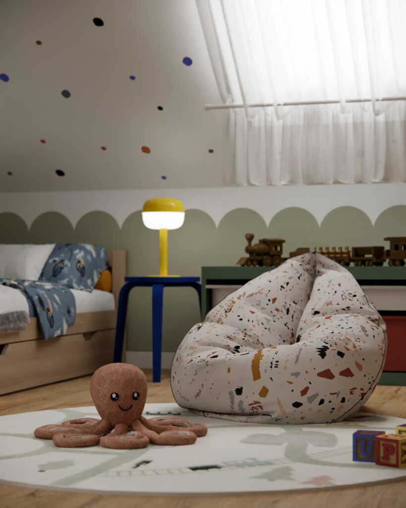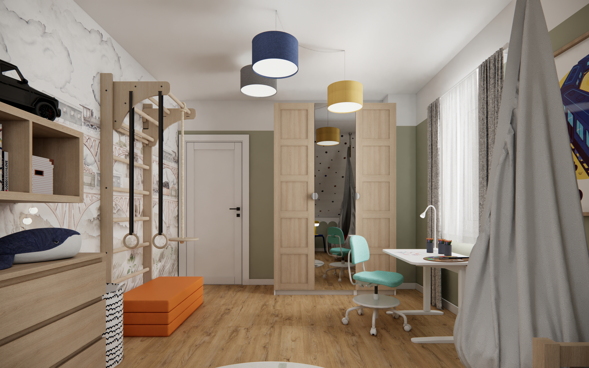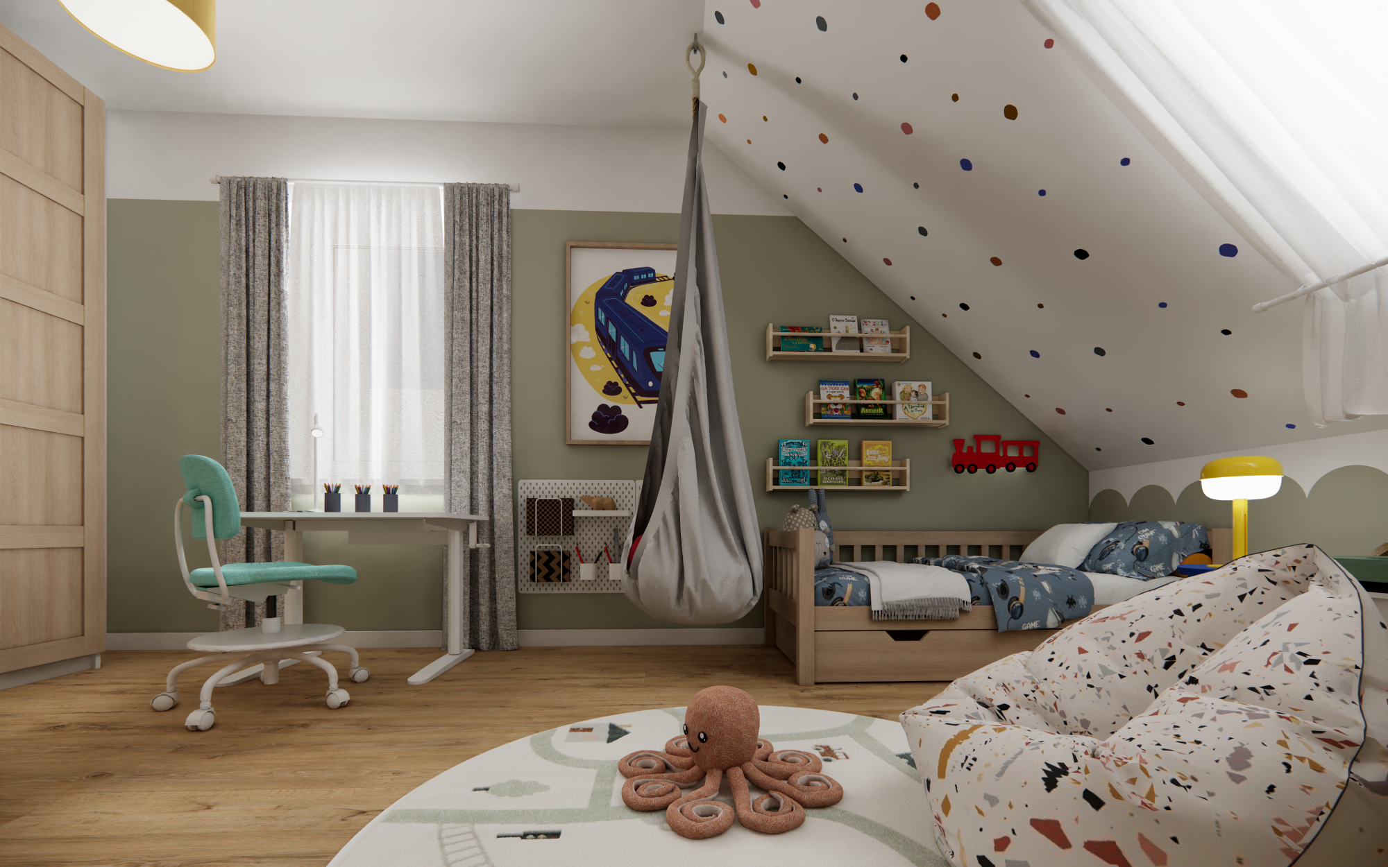 To projekt pokoju dla chłopca, który łączy dziecięcą radość z estetyką dopasowaną do całego domu. Przemyślany układ, bezpieczne materiały i możliwość modyfikacji sprawiają, że przestrzeń „rośnie” razem z dzieckiem.