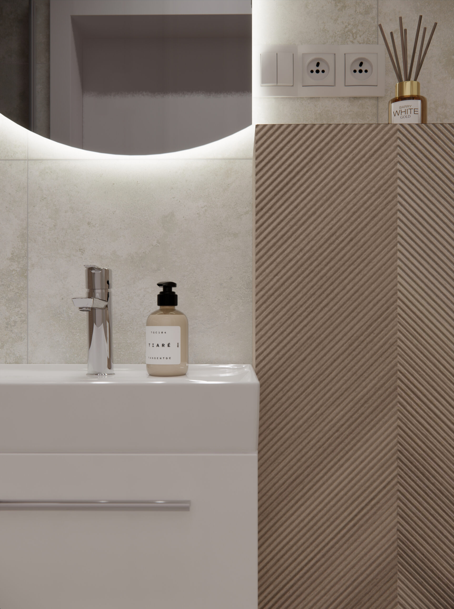 Łazienka dla gości w odcieniach szarości z akcentem drewna