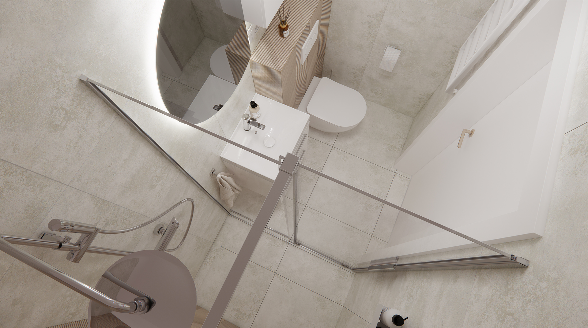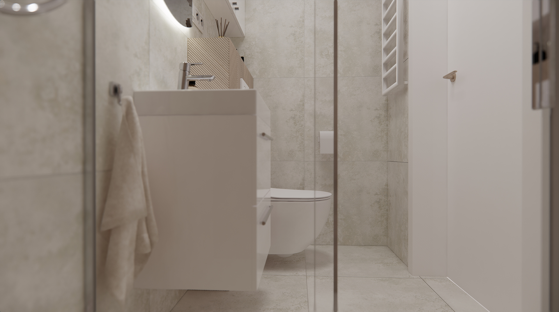 Łazienka, której projekt budowlany pierwotnie w ogóle nie uwzględniał prysznica. Po dokonaniu zmian, jeszcze na etapie budowy wygospodarowano miejsce na kabinę prysznicową. W ten sposób z WC powstała niewielka łazienka dla gości.