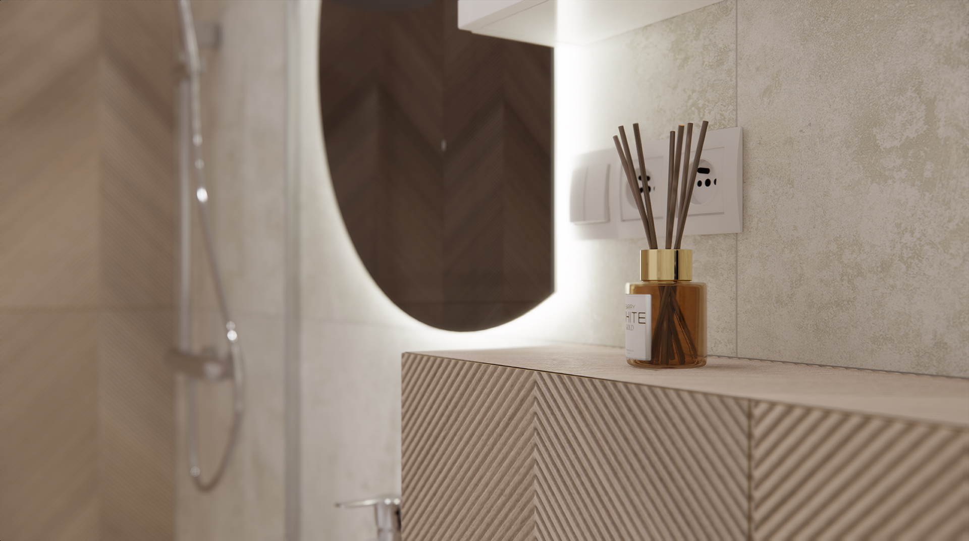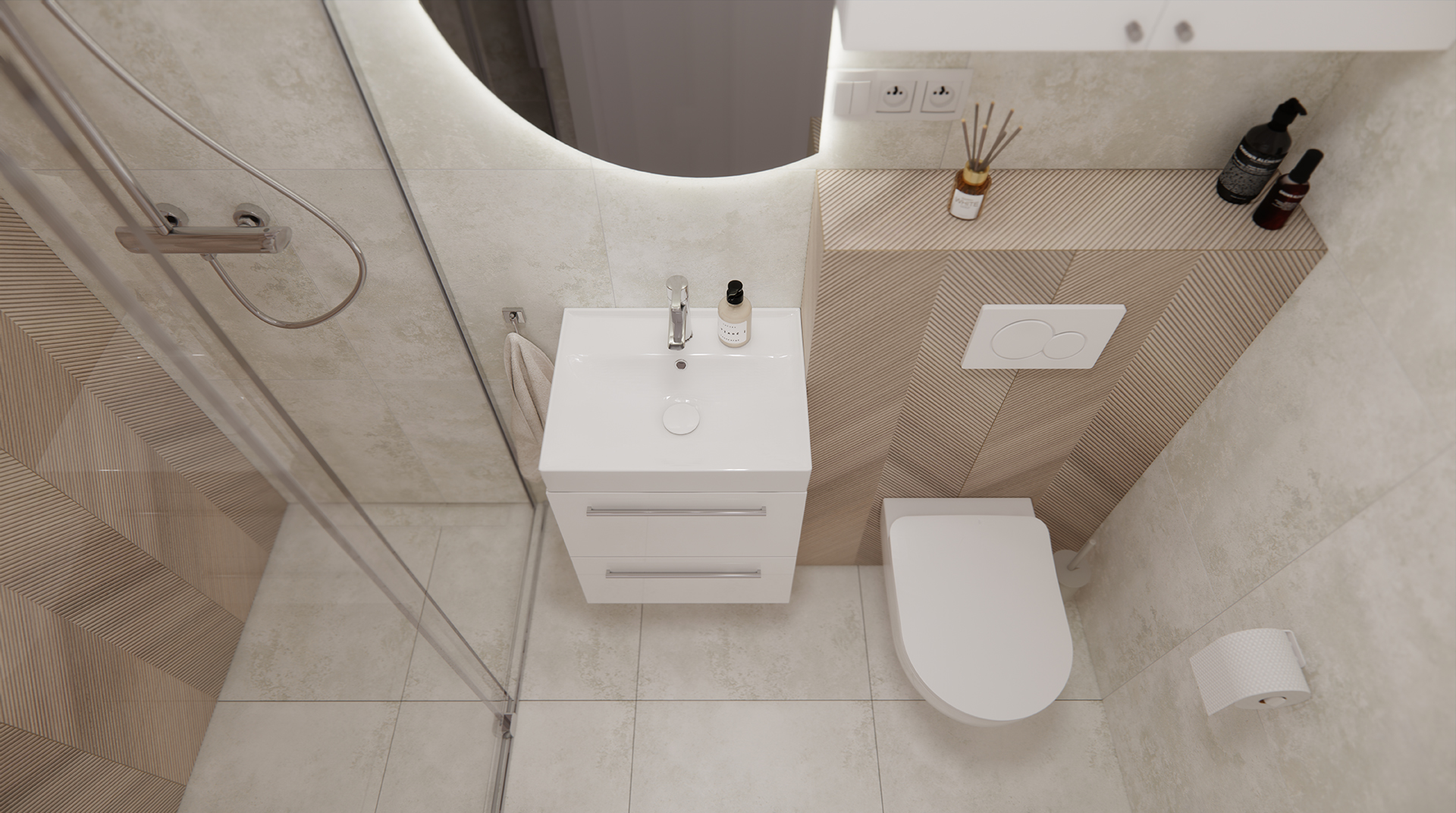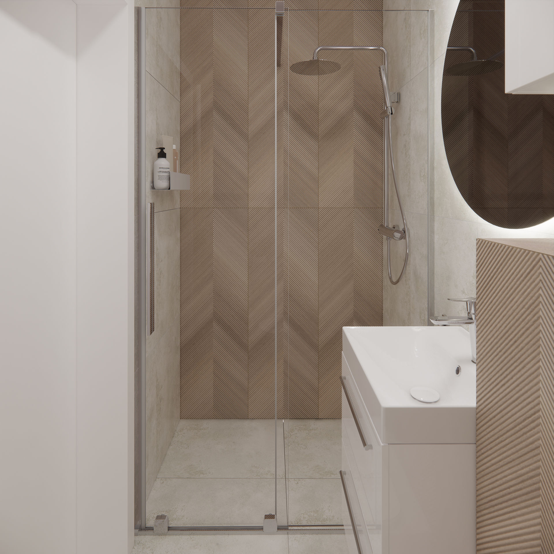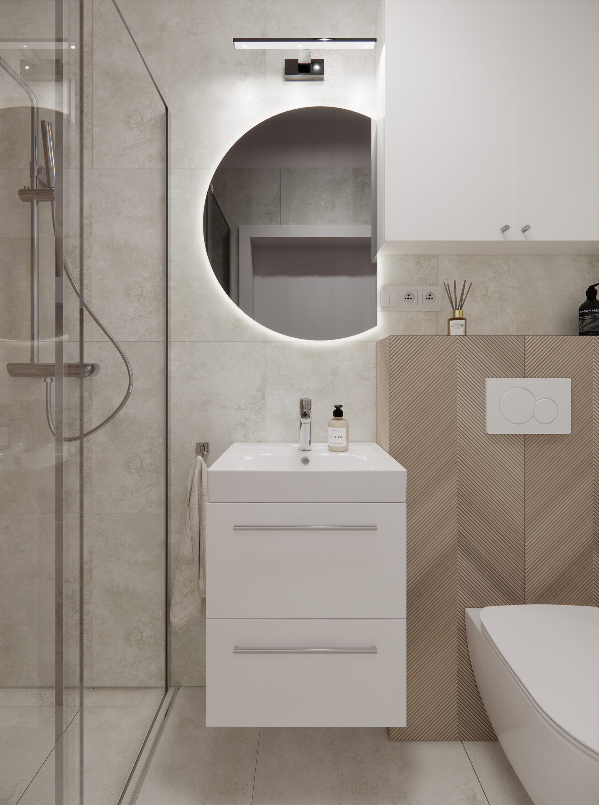 Dominująca szarość została przełamana drewnianym akcentem w postaci płytek na jednej ze ścian w kabinie prysznicowej oraz na zabudowie geberitu.